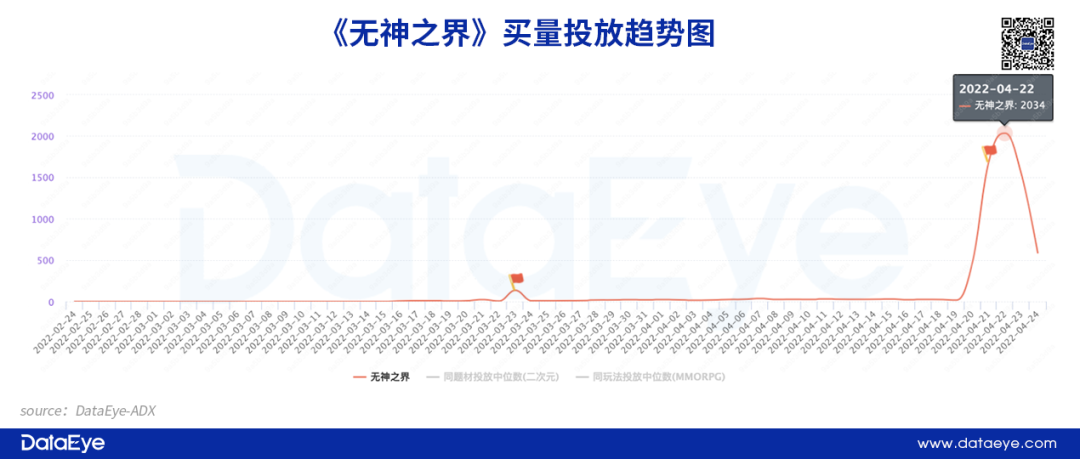 《无神之界》在正式上线第二天达到投放顶峰,单日素材投放量达到2034组,在此之前,仅在3月23日终测时有小幅度的投放;