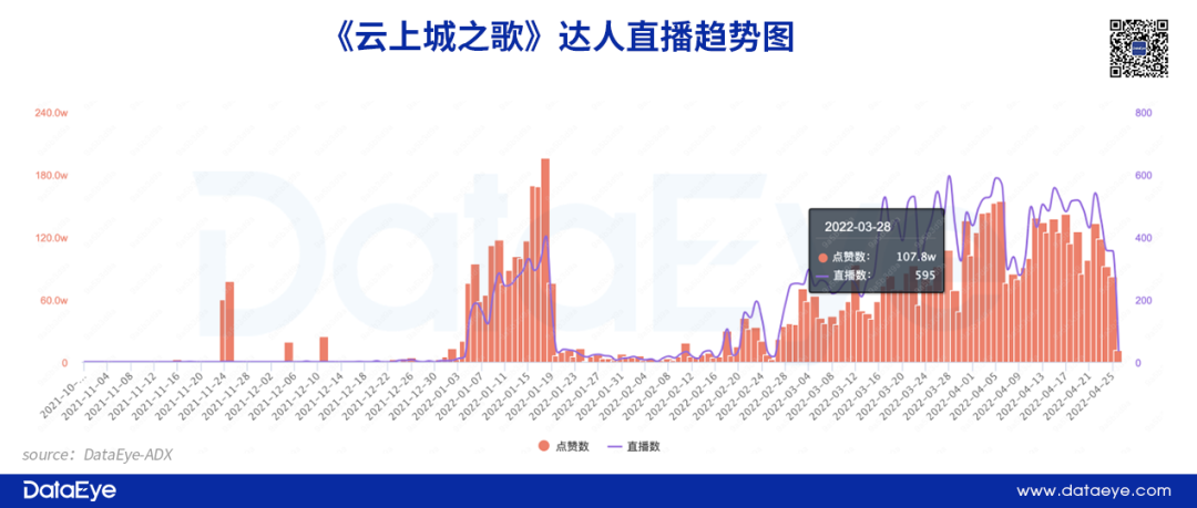 根据DataEye-ADX监测的数据统计,《云上城之歌》早在2021年11月就尝试达人直播营销。从数据来看,其在2021年的日均开播数保持在个位数。然而到了2022年,《云上城之歌》的达人直播就如同火箭般攀升,并曾在3月28日开启595场达人直播数,达到单日直播数巅峰,高场次的投入也让《云上城之歌》在iOS畅销榜一度达到第17名位置。