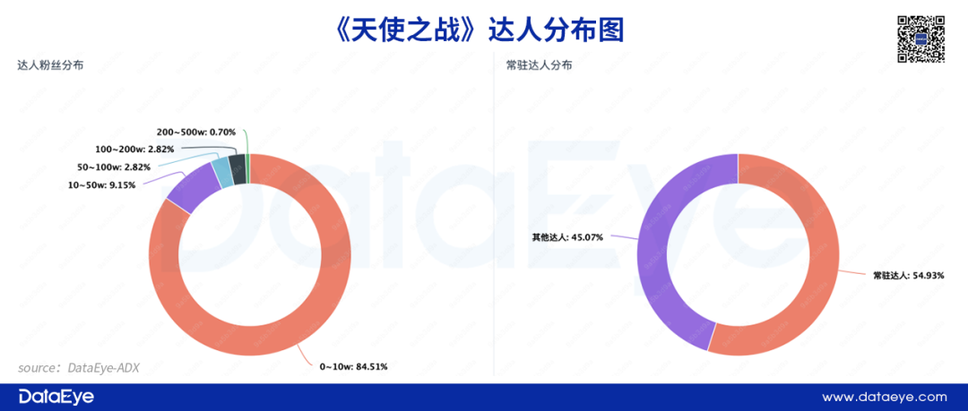 《天使之战》共邀请了142名达人直播,其中54.93%为常驻/签约达人,并且10万粉丝以下的达人占据85.51%的比例。