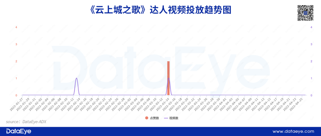 从《云上城之歌》的投放来看,其在一年前就在达人视频板块进行大范围的投放,但在最近一年时间里,《云上城之歌》的达人视频投放量直线下滑,总投放视频数仅有46组。