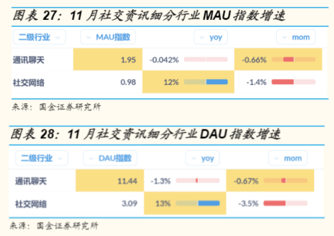 据国金指数,2021年11月通讯聊天类APP的MAU同比降低 0.042%,社交网络类同比增长12%。11月通讯聊天类DAU同比降低1.3%,社交网络类同比增长13%。