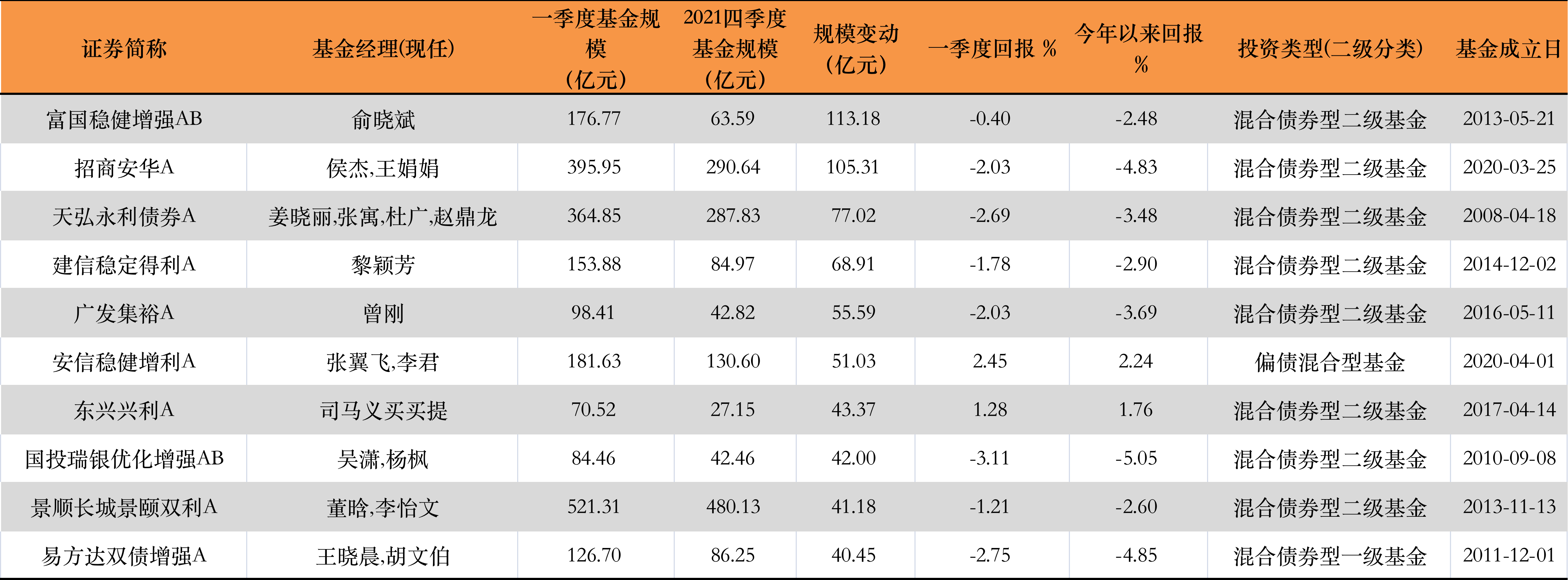 例如俞晓斌管理的富国稳健增强一季度回报虽然为负,但净申购份额达到91亿份,规模更是突增超百亿,一路从去年年底的63.59亿元增加到176.77亿元。