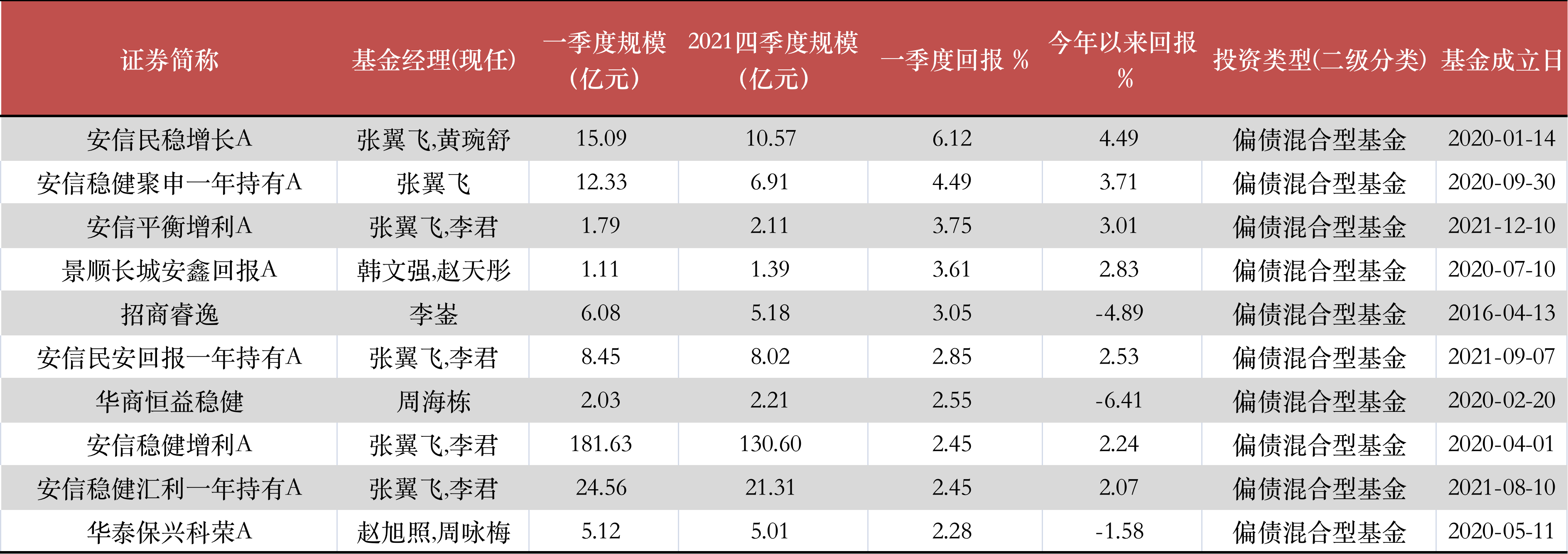 “固收+”基金整体业绩表现不是很“暖心”,一季度仅8.2%的产品获得正收益。负收益的“固收+”基金占比达到九成以上,其中净值跌幅最大的产品,跌幅已经超过了20%。界面新闻记者统计了今年一季度“固收+”基金业绩、规模榜单,其中业绩排在前十位的基金如下表所示: