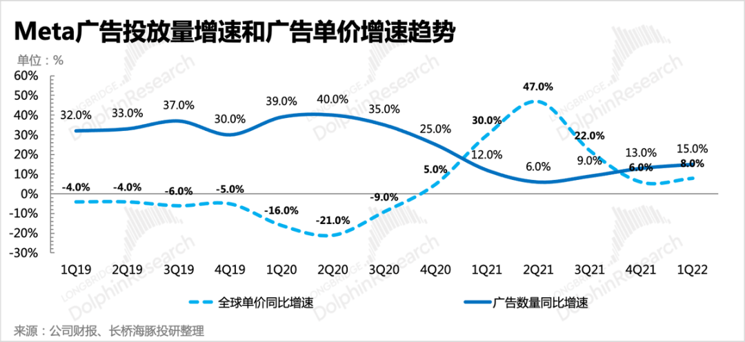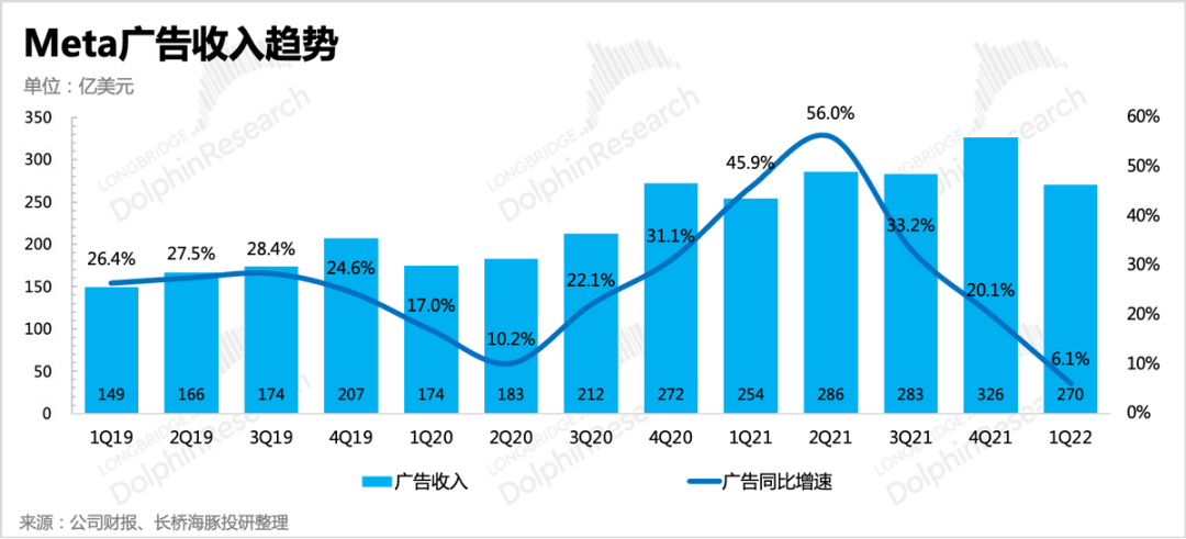 无论在元宇宙里,Meta被市场及管理层描绘得多么“前景璀璨”,短期里广告依旧是Meta的命根子。但今年行业面临的大逆风,使得收入贡献近97%的Meta,几乎无力抵抗逆风带来的增长压制。