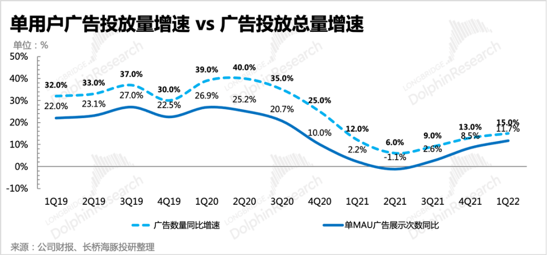 一般情况下,海豚君通过测算出「单用户广告投放量增速」这个指标来观察平台广告加载率的变化。由下图可见,一季度单用户广告投放量增速接近12%,也就是说,除了低速的用户自然增长,投放量增长绝大部分是靠广告加载率的提升来实现的。