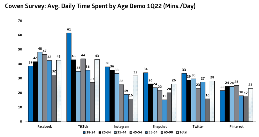 (1)Facebook在全球的渗透率最高,也预示着向上空间也已不大,尤其是在年轻用户群体中,Facebok并没有太大的吸引力。从下图Cowen的跟踪调研可以看出,在18-34岁的年龄层,Facebook与Tiktok比完全不占优势,并且整体上Facebook的用户渗透率实际是在不断走低的,即FB用户增长的背后是更多的是靠互联网流量大盘增长的带动。