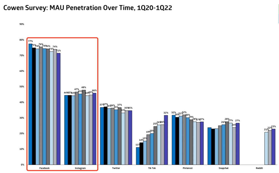 但同样的,也不能因为一个季度的回暖而忽视当前竞争胶着的冰冷事实,Meta旗下的平台中: