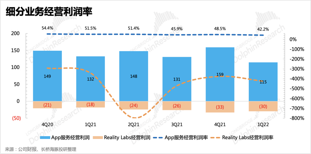 虽然有Reality Labs代表的VR/AR以及元宇宙战略的投入加大影响,但从分业务获利情况来看,元宇宙并不能背这个锅,以广告为主的App服务自身就受到收支错配带来的利润受损,无论是宏观环境、iOS ATT政策、Reels变现率低等影响,背后本质还是逃不开消费互联网竞争加剧和Meta的壁垒削弱,而目前的Reality Labs还远远不足以堪当第二增长曲线的重任。