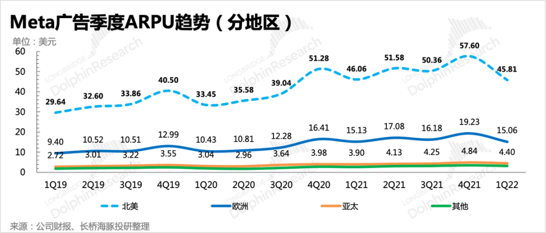 虽然亚太等其他地区的广告库存释放空间还相对较大,但广告单价不仅远低于欧美地区,并且商家对价格更敏感,提价并不轻松。因此,海豚君预计后面几个季度,Meta广告的增长压力仍然会很高。