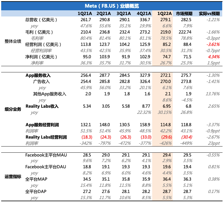 (Facebook)$Meta.US 今晨发布 2022年一季度财报,业绩本身并不好看,但预期够低,部分利空已经定价。