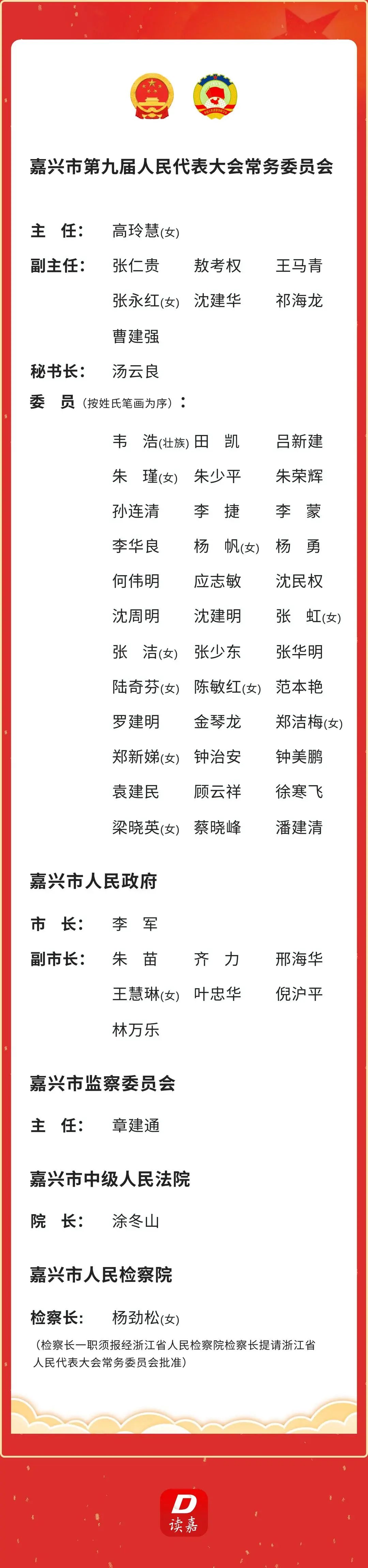 “嘉兴发布”微信公众号消息,4月28日上午,市九届人大一次会议举行第三次全体会议,依法选举产生了市九届人大常委会主任、副主任、秘书长、委员;市人民政府市长、副市长;市监察委员会主任;市中级人民法院院长、市人民检察院检察长。