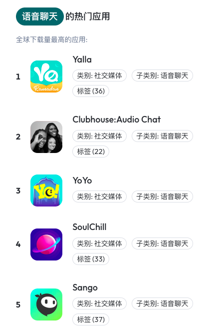 在语音社交赛道,中国玩家也验证了自己的实力。data.ai显示,全球下载量排名前5的语音社交产品分别是Yalla、Clubhouse、YoYo、SoulChill和Sango,除了去年火爆一时的Clubhouse,其余4款应用均来自中国。