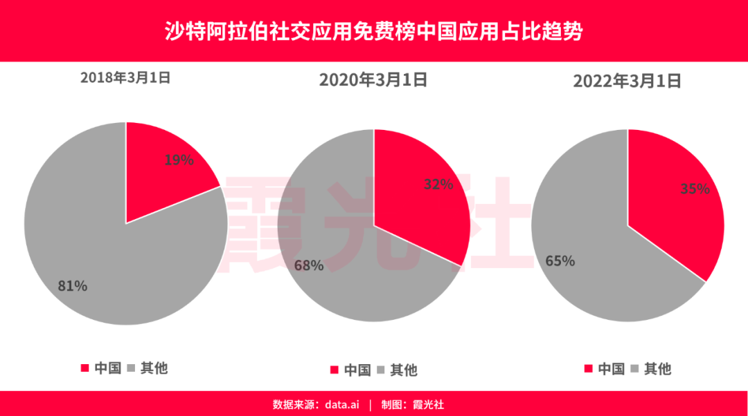 根据data.ai,4月24日,有超过24款语音社交应用进入沙特阿拉伯的社交应用畅销榜Top100,其中超过16款来自中国,中东的语音社交市场基本被中国公司牢牢占据。