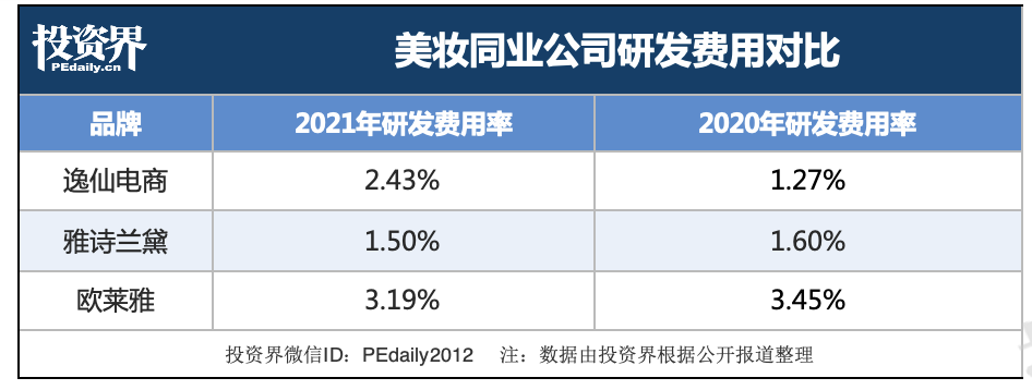 如果更直观些来看,2021年逸仙电商的研发费用率为2.43%,2020年为1.27%,而雅诗兰黛分别为1.5%、1.6%,欧莱雅集团则为3.19%、3.45%(见下图)。这意味着逸仙电商在研发上不仅位居国货美妆集团中投入头部位置,同时费率正在向国际一线化妆品公司看齐。