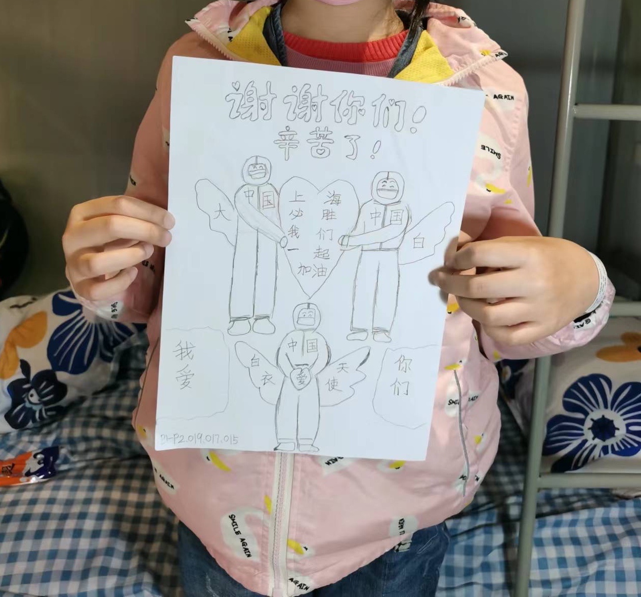 陈川告诉记者,一位母亲带着女儿入舱时很不适应,也不配合“大白”的工作。渐渐地,看着“大白”对她有求必应,为她们忙前忙后而被感动。后来,这位母亲身体恢复得越来越好,主动申请当志愿者,希望能帮助“大白”减轻些负担。她的女儿在出舱时特地画了一幅画送给医护人员,上面画着三个大白,背后都有天使翅膀,画上还写着:“谢谢你们,辛苦了,我爱你们!上海必胜,我们一起加油!”