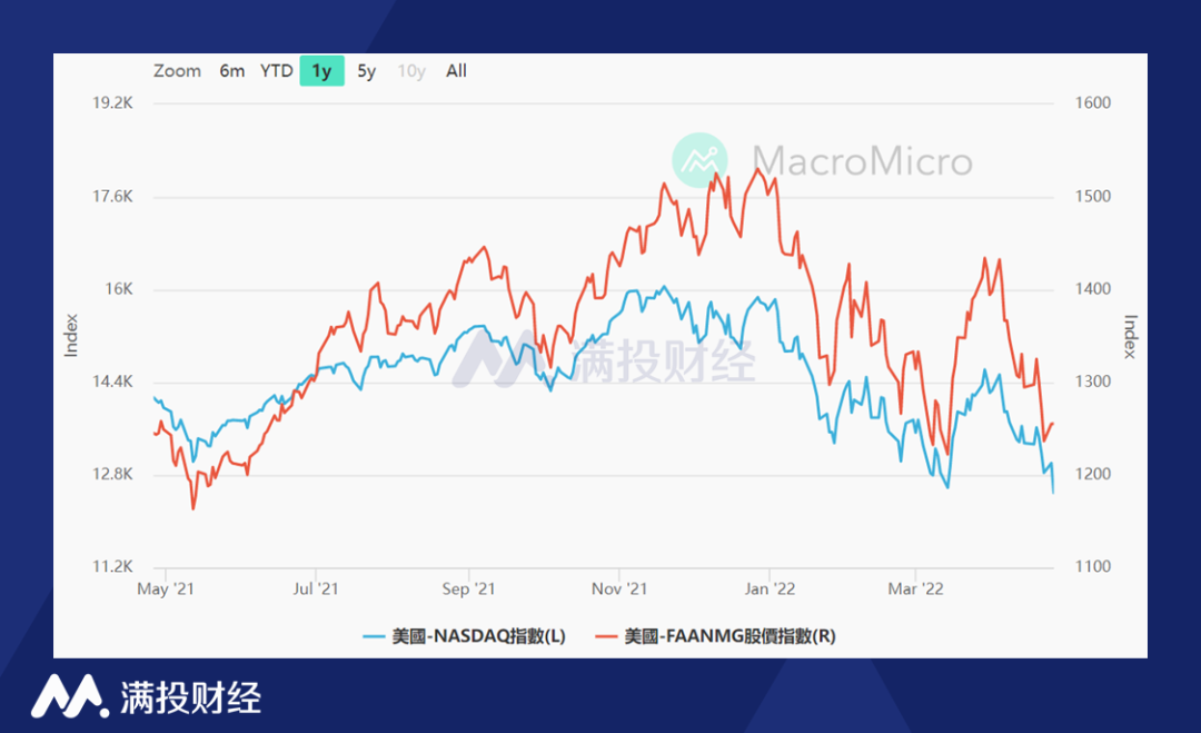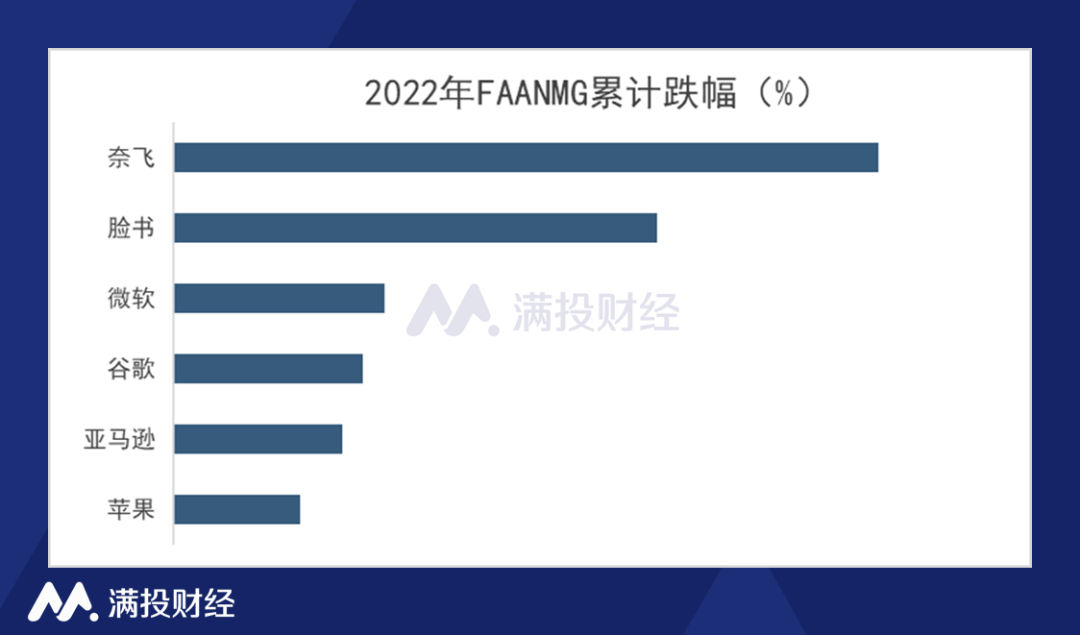 截至2022年4月26日,纳斯达克指数今年已经累计下跌了21%;标普500指数累计下跌了13%;由Meta platform Inc.、苹果公司(Apple Inc.)、亚马逊公司(Amazon.com Inc.)、Netflix Inc.、微软公司(Microsoft Corp.)和Alphabet Inc.组成的“FAANMG”指数累计下跌了17%。按照市值计,FAANMG指数目前占标普500指数的23.8%。