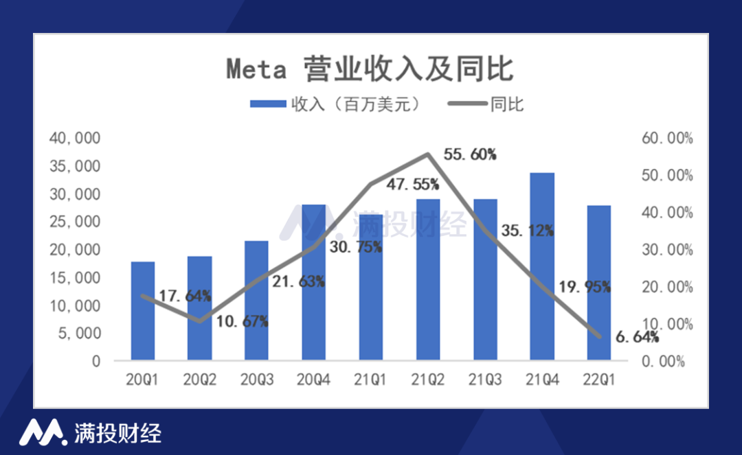 先来看公司整体的营收情况,2022年一季度,Meta实现收入279亿美元,同比增长6.64%。2021上半年之前疫情较为严重的阶段,给Meta带来了大量的用户流量,刺激了相关的商务需求,收入迎来较高的同比增速。但随着疫情的缓解,公司的收入增速已经连续四个季度显著下滑,本季度仅6.64%的同比增速已经是Meta近十年来的最低水平。