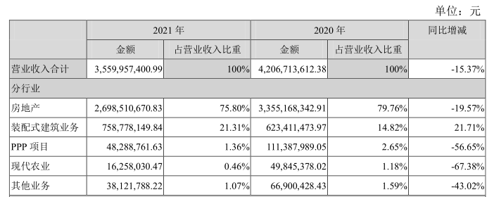值得注意的是,2021年之前,装配式建筑和现代农业均为美好置业多元布局的主要业务。不过,由于2018年-2020年现代农业业务连续亏损,2021年末,美好置业宣布退出现代农业。