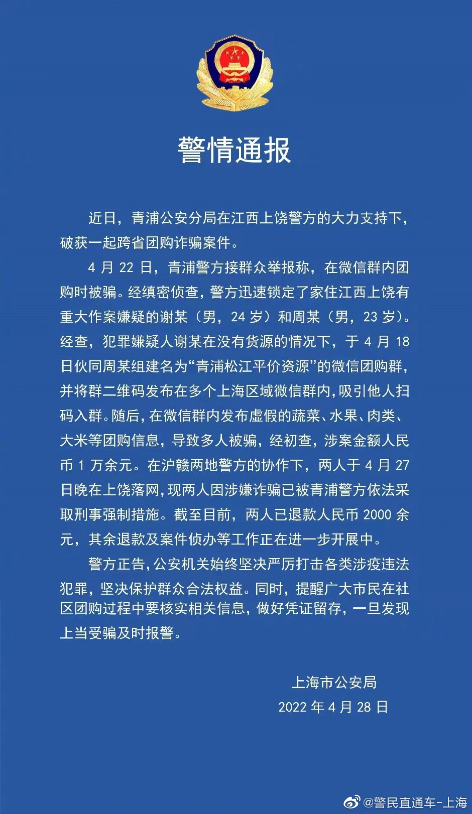 @警民直通车-上海 微博28日通报,近日,青浦公安局在江西上饶警方的大力支持下,破获一起跨省团购诈骗案件。
