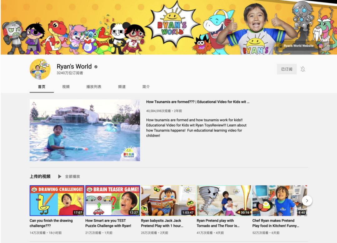 9岁时,Ryan就已经通过玩具测评体验成为了Youtube最赚钱的博主之一