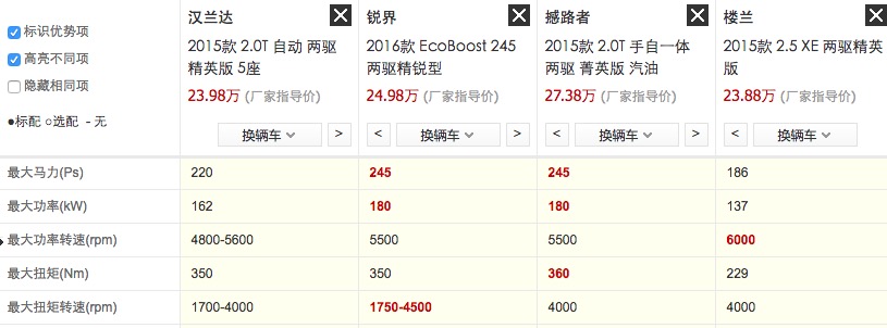 在动力方面,撼路者、楼兰、汉兰达和锐界都有配备2.0T发动机,而冠道采用双VTC直喷涡轮增压发动机,输出200千瓦和370牛米,参数上比汉兰达和锐界有一定优势。