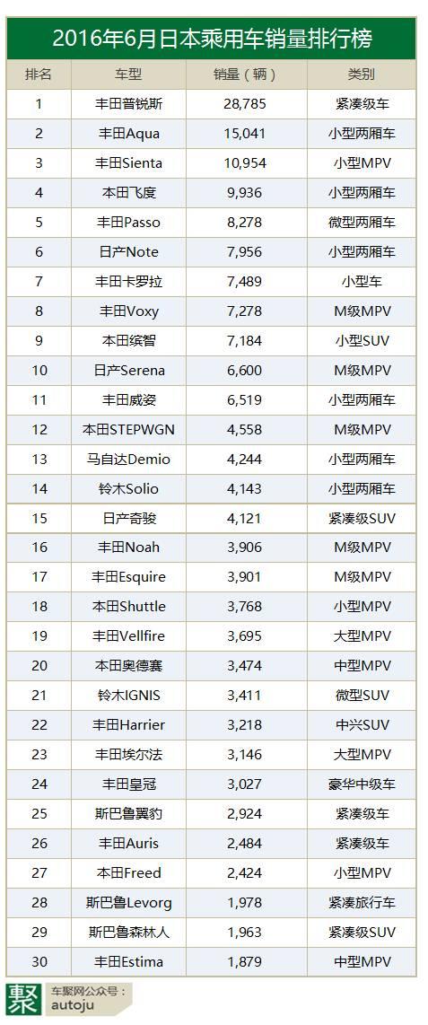 7月6日,日本汽车经销商协会(简称JADA)公布了日本汽车市场2016年6月的乘用车销量TOP 30,来围观一下吧。