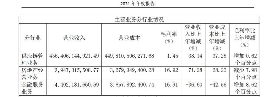 2021年,厦门国贸三大主营业务供应链管理业务、金融服务业务和房地产业务实现营收分别为4564.06亿、44.02亿、39.47亿,占整体营收比例分别为98.2%、0.95%、0.85%。