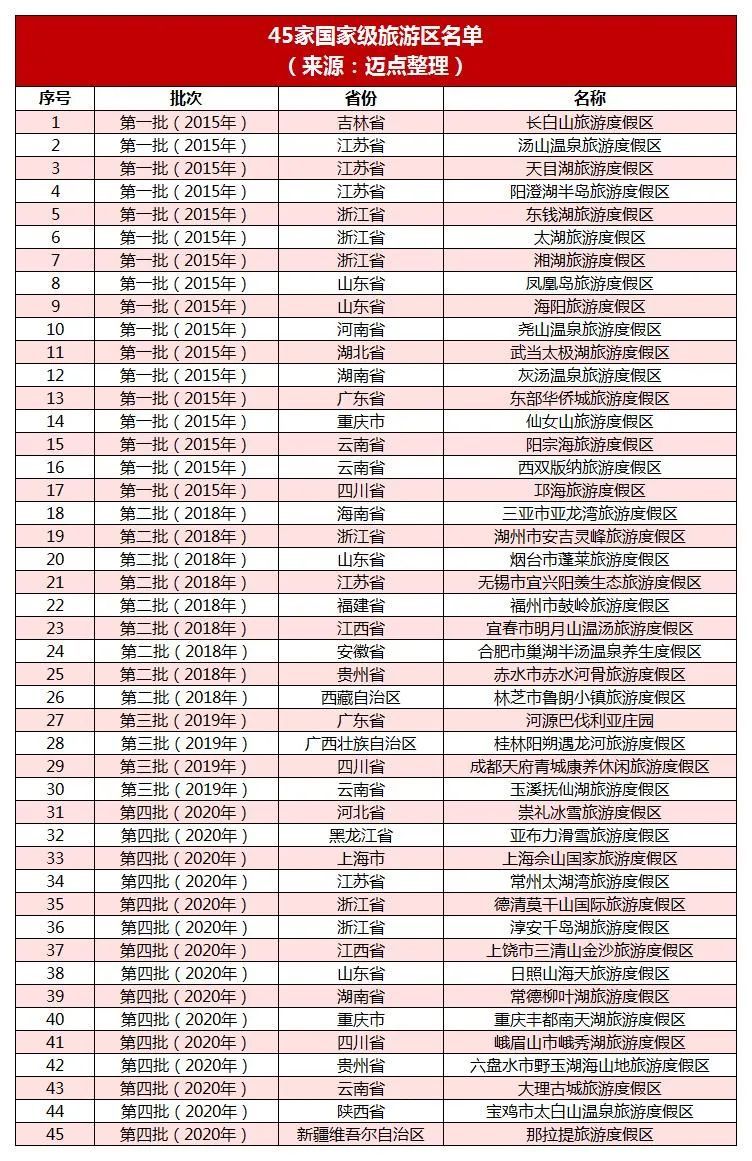 事实上,自上世纪90年代,中国提出建设国家旅游度假区以来,经过2015年、2017年、2019年、2020年四次评定,已经推选出45家国家级旅游度假区——分布于23个省级行政区内,其中数量位列前三的分别是浙江省(6家)、江苏省(5家)、云南省(4家)、山东省(4家)。