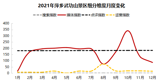 二是,强化传播,制定多重营销策略,提升景区品牌影响力。2021年,萍乡武功山景区创新旅游营销模式——旅游资源深度整合、整体营销再发力,客源市场重点开发、精准营销再延伸,主题活动丰富多彩、活动营销再升级,线上线下齐头并进、媒体营销再创新,推进品牌营销战略进一步提升“云中草原,户外天堂”品牌形象。2021年,景区旅游宣传的最大创新就是善用新媒体,景区官方抖音号发布短视频269条,粉丝总数205.5万,累计播放量2.5亿次,点赞292.1万;官方微信公众号发布推文391条,粉丝总数40.3万,累计阅读量796万次——新媒体已经成为了展示萍乡武功山景区旅游形象的重要窗口。2021年,萍乡市武功山旅游景区品牌指数整体均值为364.77,在年度5A级景区品牌指数排行榜位列全国第48位、江西省第1名。