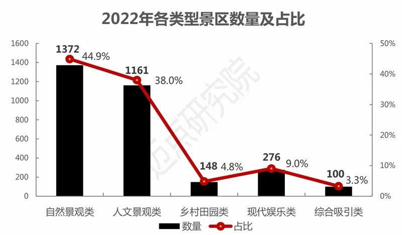迈点研究院数据显示,2022年全国5大主类景区共3057家,其中,包含山岳型景区、森林型景区、湖泊型景区、河川型景区、海滨型景区、湿地型景区、沙漠型景区、草原型景区、温泉型景区及山水型景区等在内的自然景观类景区有1372家,占到总体的44.9%。