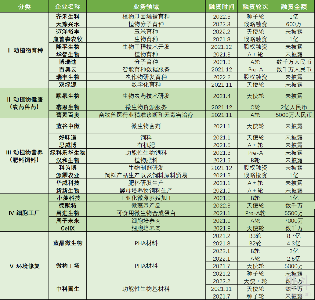在35斗发布的年度报告《农业食品大航海时代》中,我们首创按照应用场景而非技术路径的方式,将生物农业分为动植物育种、动植物健康、动植物营养、细胞工厂、环境修复等领域。本文仍然沿用这样的分类方式,以下我们将简单介绍五大应用场景,并分析国内融资情况。