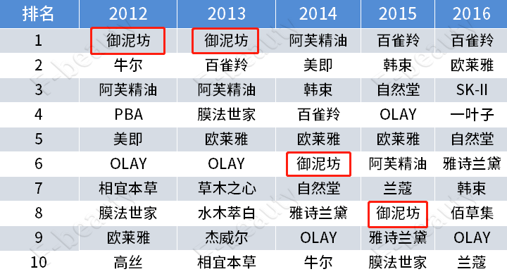 这导致主品牌御泥坊增速放缓,并逐渐在历年天猫双十一排位的争夺中,淡出视野。自2016年,御泥坊品牌掉出当年天猫双十一化妆品前十排行榜后,就再没能入榜。