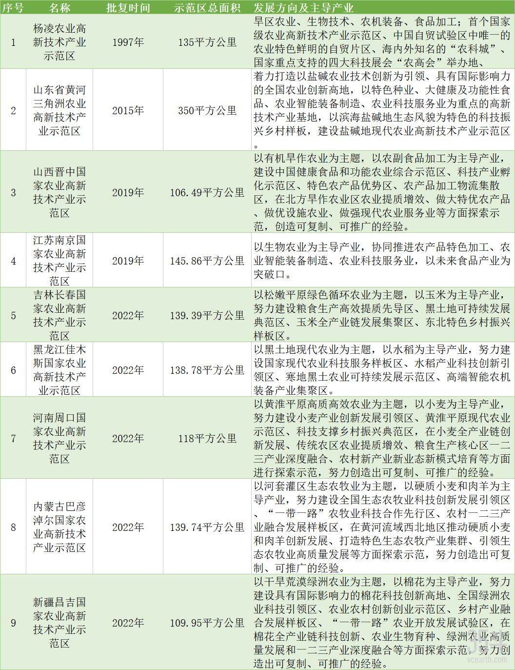2022年4月28日,国务院发文,批复同意建设吉林长春、黑龙江佳木斯、河南周口、内蒙古巴彦淖尔、新疆昌吉国家农业高新技术产业示范区(下称:国家农高区)。加上此前已批复的陕西杨凌、山东黄河三角洲、山西晋中、江苏南京国家农高区,截至目前,全国已有9家国家农高区。