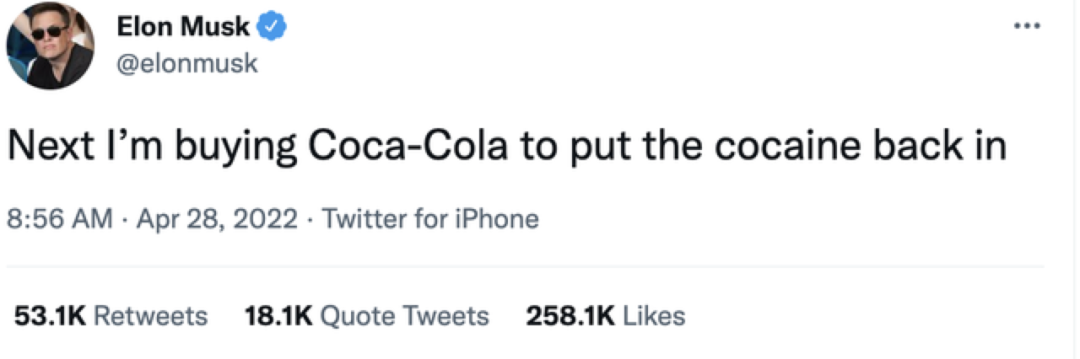 当地时间4月28日,马斯克发布推特,称“Next I’m buying Coca-Cola to put the cocaine back in(接下来我要收购可口可乐,并把可卡因放回去)”。言论一出,全球震惊,此推文仅仅用了几个小时,就收获了超过10万条评论,以及百万个赞。