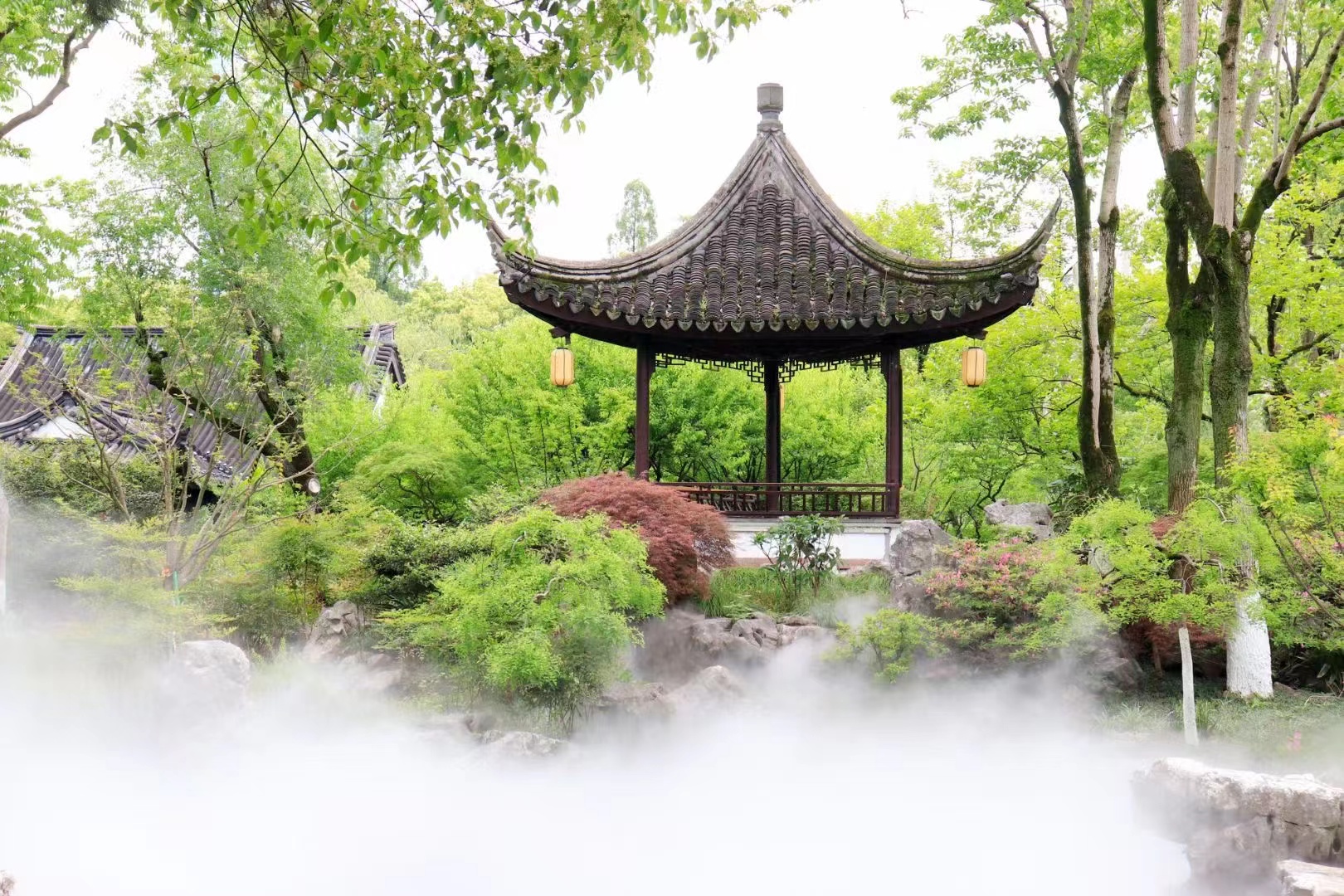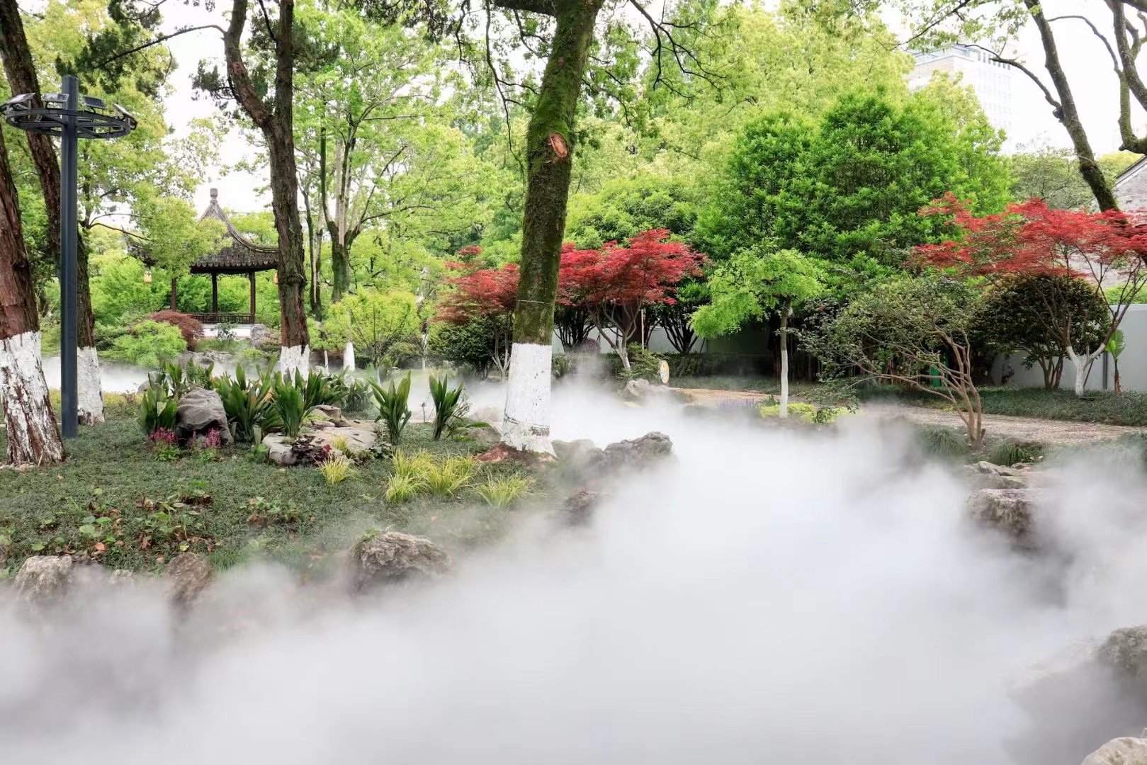 这般“仙境”如何而来?原来是月湖景区特意打造了“雾森”景观。雾森系统是通过高压使水雾化,达到与自然雾相同的景观效果,在美化景观的同时,对于增加环境湿度、除尘、降低PM2.5、增加负氧离子浓度也有显著效果。雾森系统不仅达到起到清凉降温效果,同时系统工作时喷洒出大量微小雾粒散发在周围的空气中,使空气其中中饱含水汽,起着增湿净化空气的作用,让人们在城市中心的公园就能感受到这样的“仙境”。