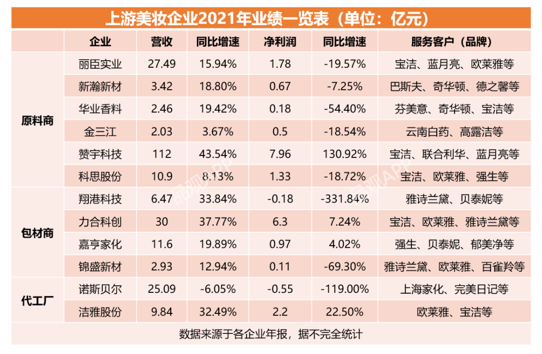 在上述统计的12家美妆上游企业中,11家企业均实现了营收的同比增长,其中赞宇科技涨幅甚至超过43.54%。