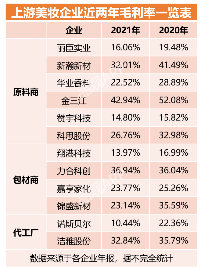 据化妆品观察不完全统计,目前国内已公布年报的12家美妆上游企业里,有8家企业去年的净利润呈现负增长,占比达到2/3,而这一数值在2020年为5家。这也即意味着,过去一年,工厂净利润下滑状态更为凶猛。
