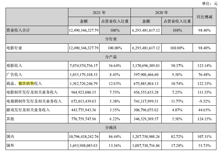 4月28日,万达电影股份有限公司发布2021年年度报告。报告期内,公司实现营业收入124.9亿元,同比增加98.4%。其中,商品、餐饮销售收入为15亿,毛利率达63.49%。