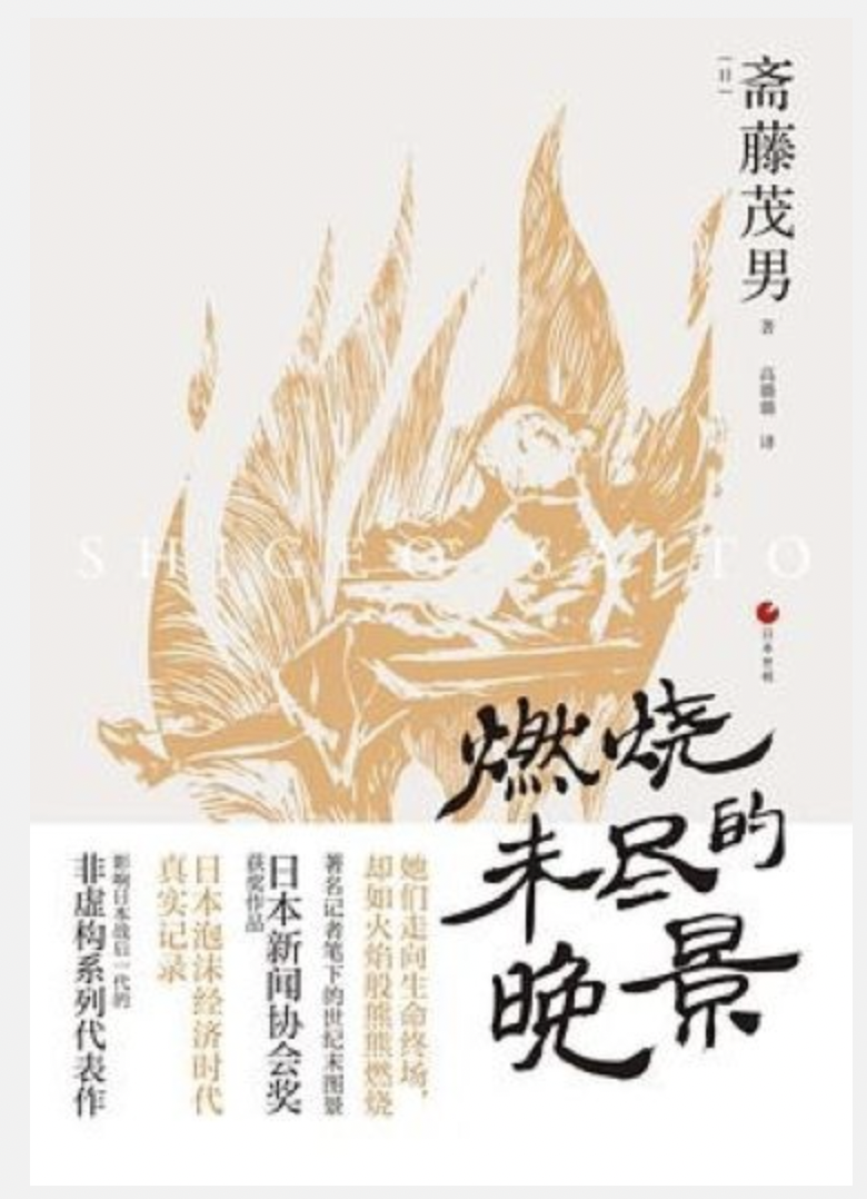 被誉为 “生涯一记者”的斋藤茂男,著有纪实文学系列《日本世相》,共计12册,记录了日本70年代到90年代各类普通人的生活实景和心理状态。浙江人民出版社的“日本世相”丛书,最新推出了斋藤茂男的《燃烧未尽的晚景》。该书是口碑之作《妻子们的思秋期》的续篇,记录了老年人,尤其是老年女性的生存实态,如痴呆老人的家庭压力、老人无言赴死以及在生命最后阶段迸发的爱和生命力。