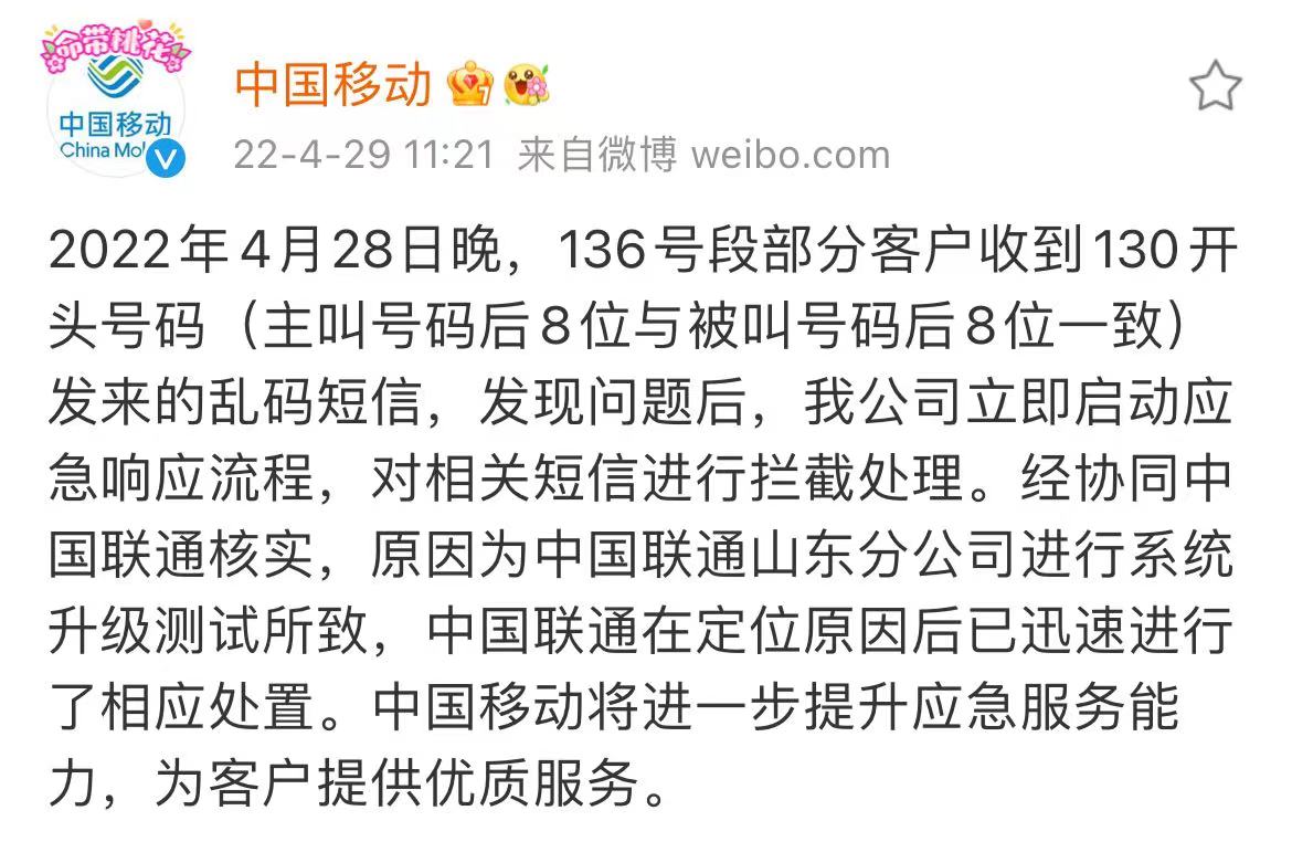 4月29日@中国移动 发文称,4月28日晚,136号段部分客户收到130开头号码(主叫号码后8位与被叫号码后8位一致)发来的乱码短信,发现问题后,公司立即启动应急响应流程,对相关短信进行拦截处理。经协同中国联通核实,原因为中国联通山东分公司进行系统升级测试所致,中国联通在定位原因后已迅速进行了相应处置。