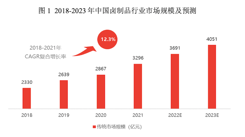 艾媒咨询于2022年2月发布的报告显示,2022年中国卤制品行业的规模有望突破3600亿,其中2018年-2021年复合增长率12.3%。