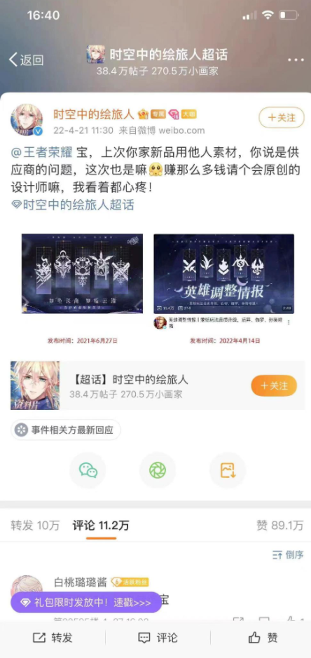 4月21日,一则“阴阳怪气”的微博将腾讯(00700.HK)旗下手游《王者荣耀》送上了热搜,发出此条微博的则是网易旗下手游《时空中的绘旅人》官微,在该条微博中,还配上了两款游戏的素材对比图,以此来指控《王者荣耀》抄袭。