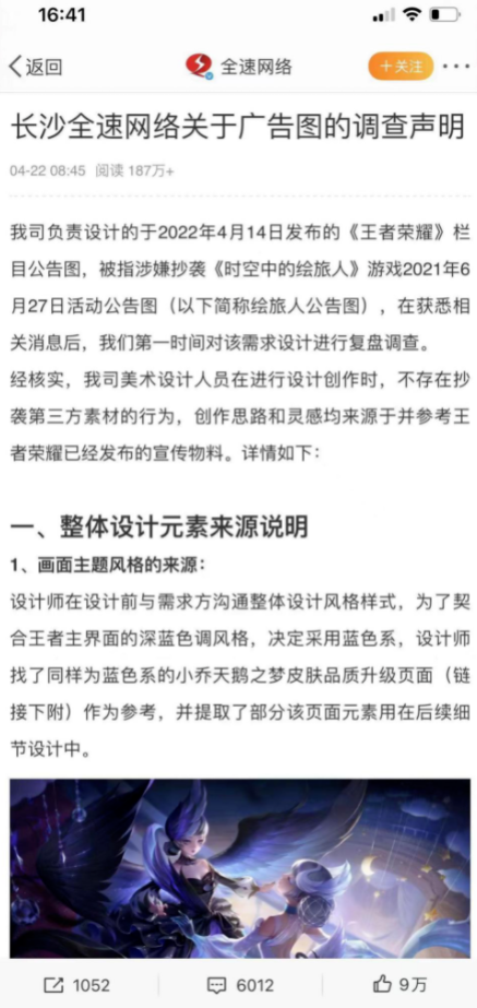 事件发酵不久后,《王者荣耀》供应商全速网络发布公告称“会尽快作出完整说明”,并在次日发布的调查声明中称“不存在抄袭第三方素材的行为”。