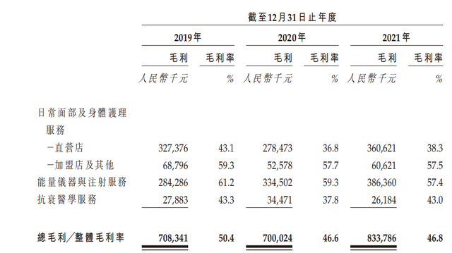 招股书显示,在公司现有的三块业务中,美容护肤毛利率最低,特别是直营店,2021年只有38.3%,加盟店毛利率57,5%,但实际营收在美容业务中占比很低;最高的是医美,2019年毛利率高达61.2%,2020年59.3%,2021年毛利率57.4%;抗衰老医学服务2021年毛利率43%。
