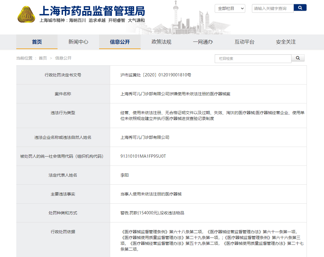 2019年12月10日,上海秀可儿门诊部有限公司因“未按照医疗器械说明书和标签标示要求运输、贮存医疗器械”被罚2万元。2020年11月30日,这家公司又因“经营、使用未依法注册、无合格证明文件以及过期、失效、淘汰的医疗器械”,被没收物品,罚款15.4万元,责令改正,警告。