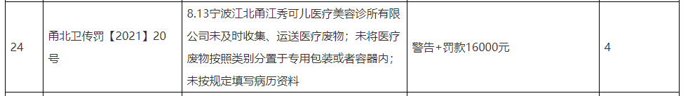 2021年9月16日,美丽田园旗下的宁波江北甬江秀可儿医疗美容诊所有限公司因医疗废物处置问题,被警告并罚款1.6万元。