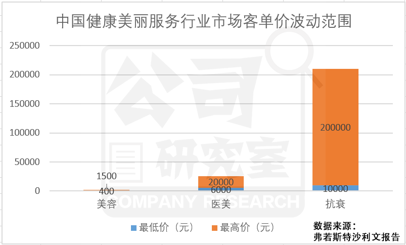 不过,对比一下整个这三类业务的客单价,也许就不奇怪了。弗若斯特沙利文数据显示,国内美容护肤客单价介乎400元至1500元(人民币,下同),受众规模来看,2020年达到1.52亿人,并预计将长期继续增长到2030年达到1.98亿人左右。与此同时,医美客单价高达 6000 元至 20000 元,并且渗透率仍低,2020 年服务项目数(每千人)仅 16.1 次;抗衰老业务每位客户每年支出约在人民币 10,000 元至人民币 200,000 元之间。