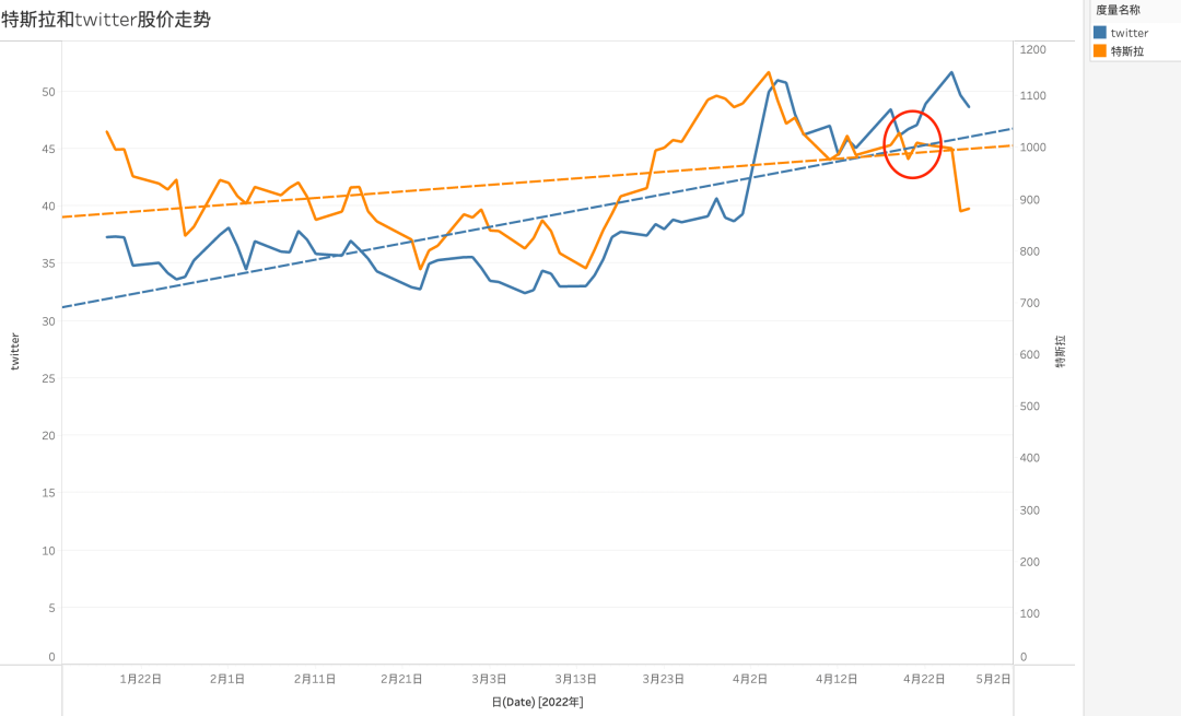 在上图中我们可以直观看到收购消息传出后相关公司股价的变化情况,概括性说:twitter股价的上扬对冲了特斯拉下跌的空间,这其实也是马斯克收购的初衷。