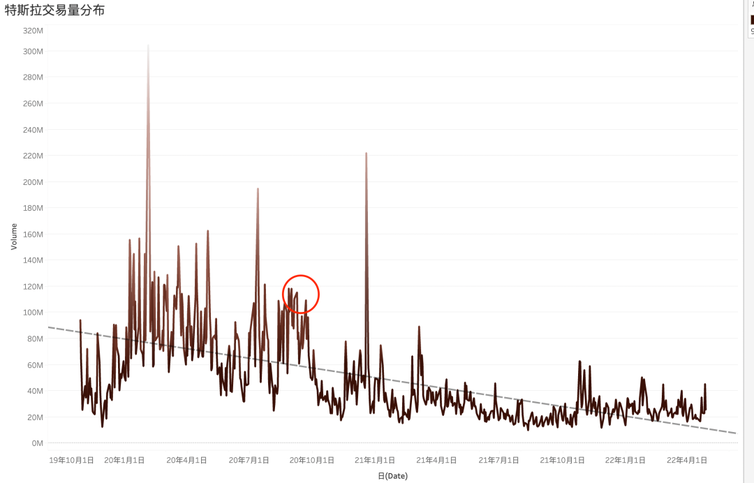 可以看到,在股价的上升中特斯拉的交易规模是逐渐萎缩的,这一方面由于高股价带来的交易门槛的上升(令一些个人投资者望而却步),另一方面也是投资者对股价过快上升担忧的投射。