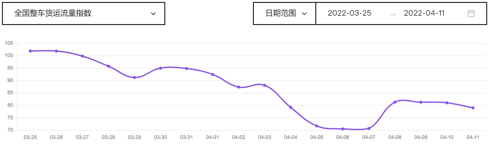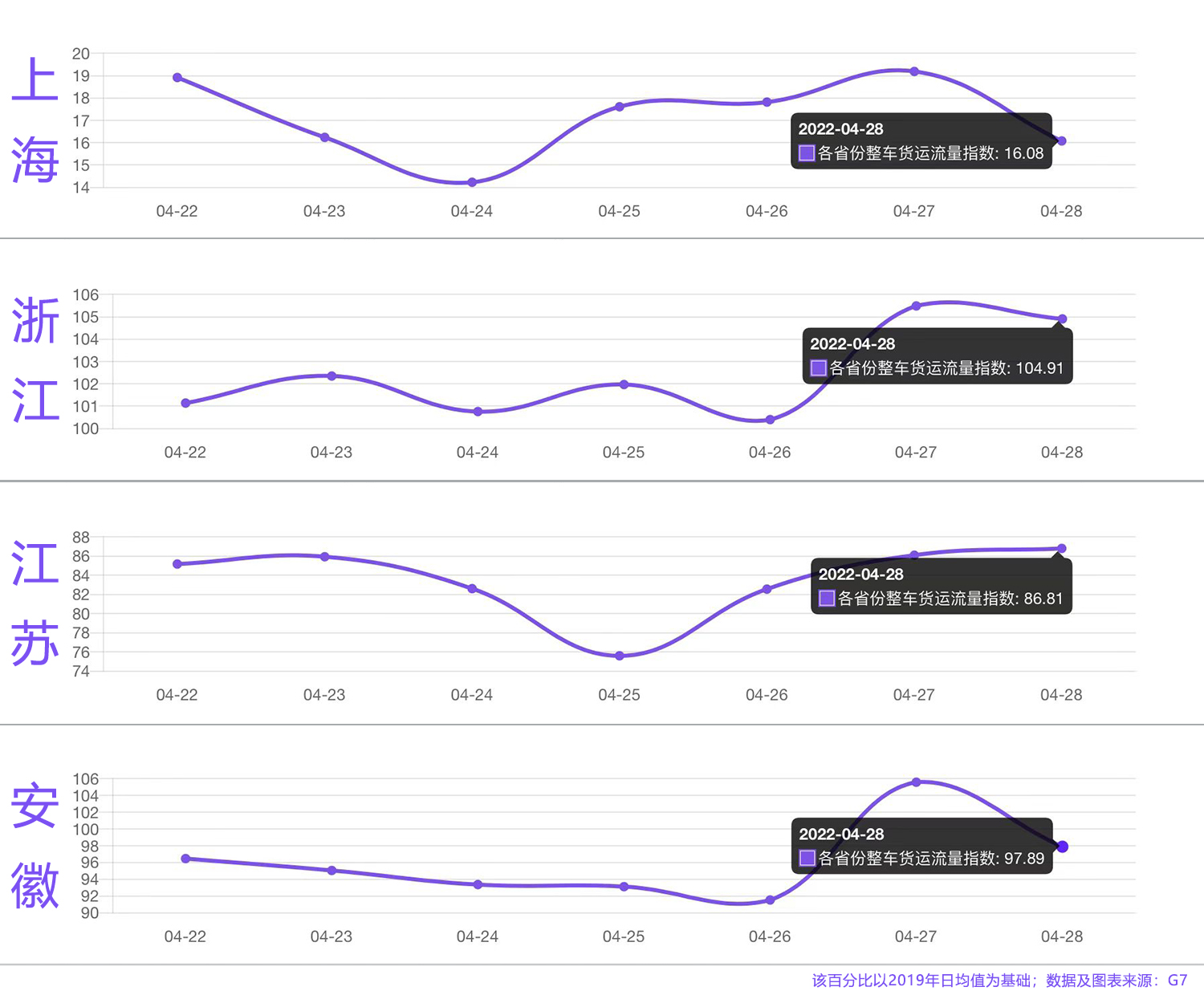 物联网科技平台G7大数据显示,从3月27日起,全国整车货车流量开始显著下降,到4月6日和7日下降至最低点,当时全国整车货车流量只有2019年日均值的70%。(注:图中流量指数表示当天车流量相当于2019年日均值的百分比值)